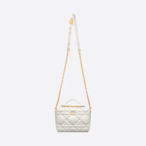 Maria Grazia Chiuri’s Dior Caro box bag is a modern creation. Crafted in latte calfskin, it stands out with a unique Macrocannage quilted effect and a spacious compartment, including three card slots, to accommodate all the daily essentials. The removable chain strap features a leather insert for comfortable and adjustable wear, either over the shoulder or crossbody, while the handle allows it to be carried by hand.