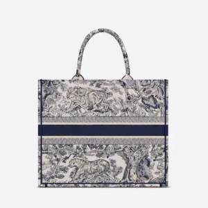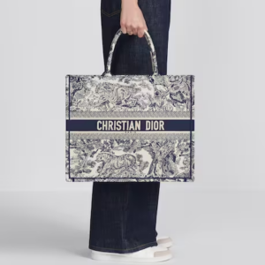 Introduced by Maria Grazia Chiuri, Creative Director of Christian Dior, the Dior Book Tote has become a staple of the Dior aesthetic. Designed to hold all the daily essentials, the style is fully embroidered with a blue Toile de Jouy motif. Adorned with the ‘CHRISTIAN DIOR PARIS’ signature on the front, the large tote exemplifies the House’s signature savoir-faire and may be carried by hand or worn over the shoulder.