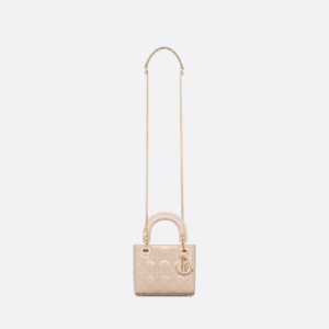 The Lady Dior handbag epitomizes the House’s vision of elegance and beauty. Refined and sleek, the timeless creation is crafted in Aesthetic beige patent calfskin and covered with Cannage stitching, creating an instantly recognizable quilted texture. Pale gold-finish metal D.I.O.R. charms embellish and illuminate its silhouette. Featuring a removable chain shoulder strap, the miniature Lady Dior bag can be carried by hand or worn crossbody as an ideal evening wear companion.
