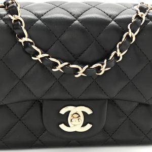 This is an authentic Lambskin Quilted Mini Square Flap in Black. This classic bag is finely composed of luxurious diamond quilted lambskin leather in black. The bag features a waist-length light gold chain link leather threaded shoulder strap and a light gold CC turn lock. This opens the front flap to a black leather interior with a zipper and patch pockets.