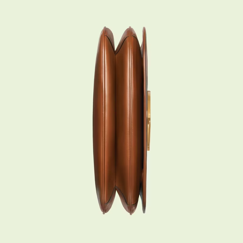 Coming from the House’s archives, a geometrically shaped version of the Interlocking G logo is reintroduced for Luxury Love Parade. The emblem enriches the design with a timeless feel—mirroring the Hollywood glamour that shaped the fashion show. This medium-sized version of the accessory is presented in brown leather.