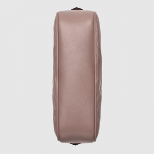 The small hand shoulder bag has a softly structured shape and a zip top closure with the Double G hardware. The shoulder strap has a leather shoulder detail. Made in matelassé leather with a design.