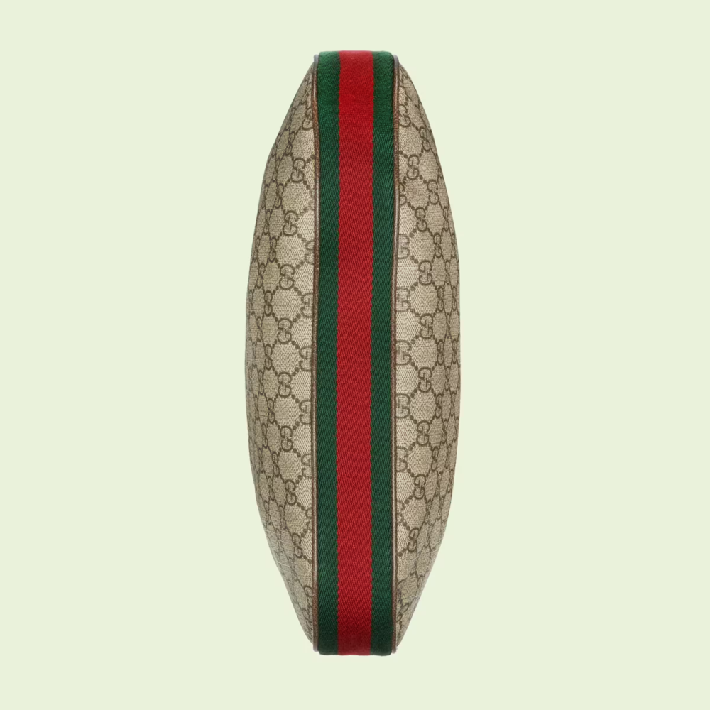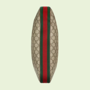 An ode to the timeless Hollywood glamour that shaped Luxury Love Parade, elements from the House’s archives are reintroduced. Distinguished by its crescent moon shape, the accessory is further defined by a G shaped hook closure. Paired with soft materials, the heritage hardware creates a refined design with appeal. This large version is crafted from beige and ebony canvas, complete with a green and red Web trim.