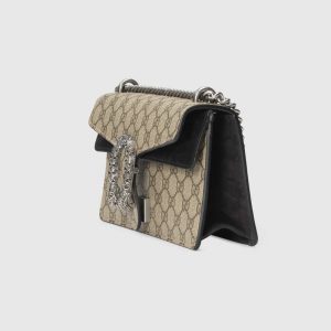 The small shoulder bag is presented in the signature pattern, trimmed with black suede details. The shape is defined by the defining tiger head closure—a unique detail referencing the Greek god Dionysus, who in myth is said to have crossed the river Tigris on a tiger sent to him by Zeus—further enhanced with sparkling crystals. The sliding strap can be worn multiple ways, changing between a shoulder and a top handle bag.