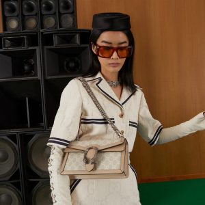 A heritage material from the archive, has been reimagined in Luxury Love Parade in different color combinations and combined with contemporary as well as styles. The is presented in a beige and white variation of the signature material with a tonal trim. Originally a play on a ’30s design, the canvas speaks to the historical narrative that runs throughout the collection.