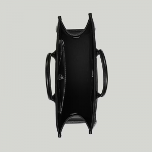 Signature luage pieces from the jumbo line spotlight an all-black design for Spring Summer 2023. A reinterpretation of Luxury o Luxury ‘s initials, the features prominently in size for a distinctive logo feel atop this tote bag with additional shoulder strap.