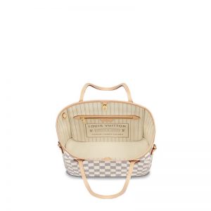 The PM tote pairs timeless design with heritage details. Crafted from Damier Azur canvas with natural cowhide trim, it is capacious yet not bulky, with side laces that cinch for a sleek allure or loosen for a casual look. Slim, comfortable handles slip easily over the shoulder or arm. Lined in colorful textile, it features a removable totewhich can be used as a clutch or an extra pocket.