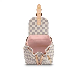 18.5 x 28 x 11.5 cm (Length x heightx width ) •7.3 x 11 x 4.5 inches•Damier Azur coated canvas exterior•Rose Ballerine microfiber lining•Natural cowhide leather trim•Shiny colored metallic pieces•Puffed handle•2 adjustable flat shoulder / cross•body straps•Drawstring top closure secured by a flap and prong buckle closing system with magnet•Exterior zipped pocket•Interior smartphone pocket•Interior D•ring