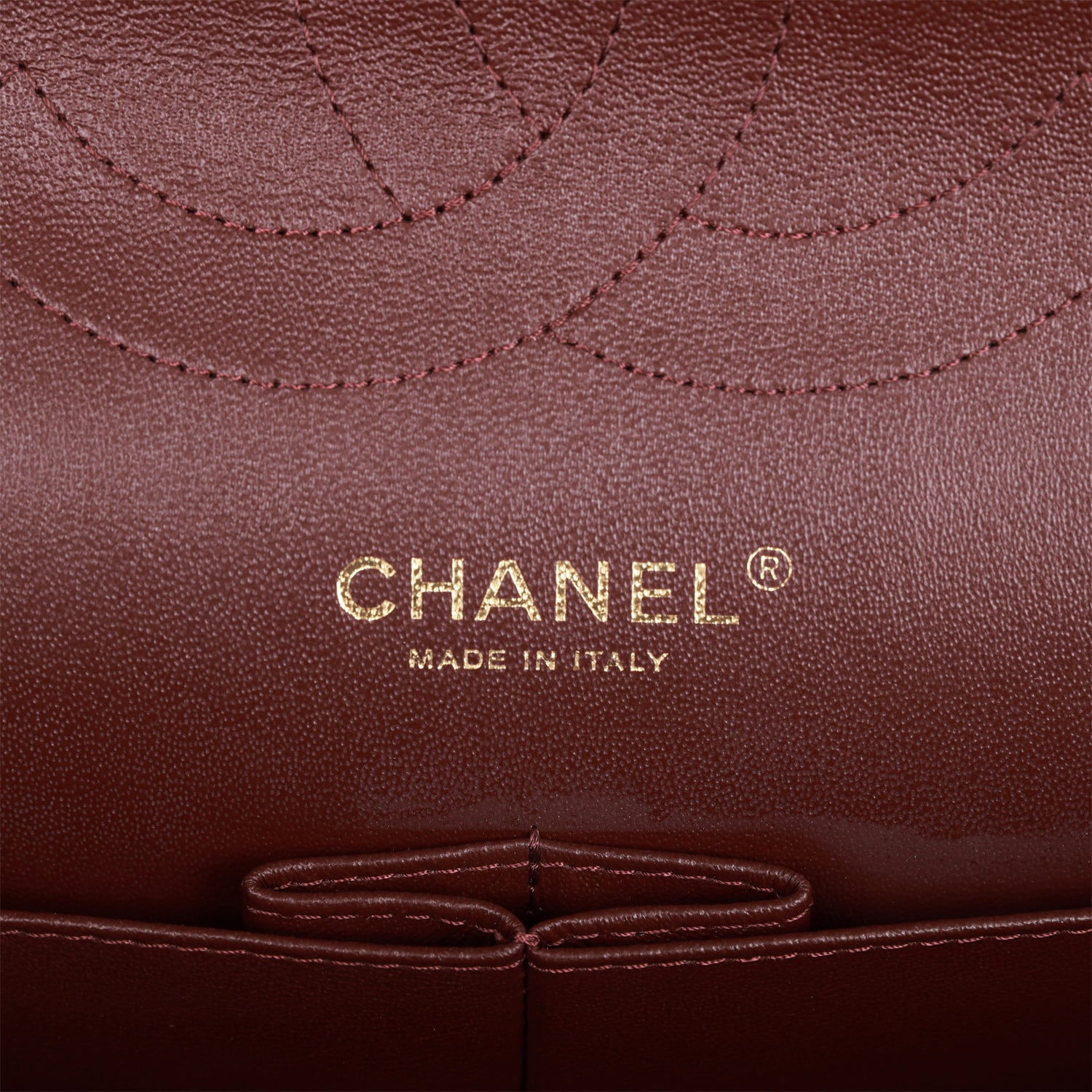 The interior is lined in burgundy leather with a “love letter” zipper compartment under the first flap. an”outer” slit pocket under the second flap. and an?interior compartment with two open pockets separated by a “lipstick” compartment.