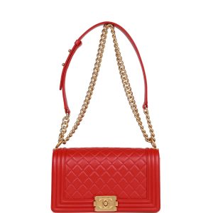 This Old Boy bag is in red leather with?tone hardware and features a full front flap with the Le Boy push lock closure and an tone link and red leather padded shoulder/crossbody strap.