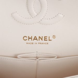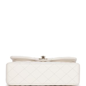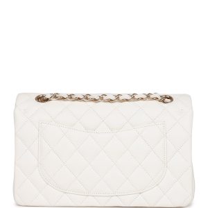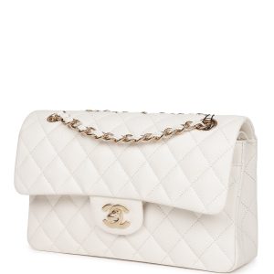 This Small Double Flap bag is in white leather with light tone hardware and features a front flap with signature turnlock closure. half moon back pocket. and adjustable interwoven light tone link and white leather shoulder strap.