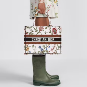 Introduced by Maria Grazia Chiuri, Creative Director of Christian Dior, the Dior Book Tote has become a staple of the Dior aesthetic. Designed to hold all daily essentials, the style is fully embroidered with a white multicolor Dior Petites Fleurs motif, a romantic and vibrant homage to Mr. Dior’s passion for florals. Adorned with the Christian Dior Paris signature on the front, the medium tote exemplifies the House’s signature savoir-faire and may be carried by hand or worn over the shoulder.