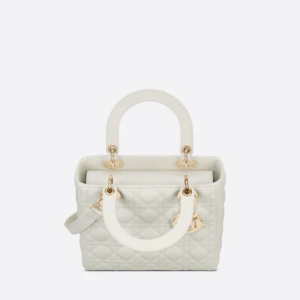 The Lady Dior bag epitomizes the House’s vision of elegance and beauty. Sleek and refined, the timeless style is crafted in latte lambskin with Cannage stitching, creating the instantly recognizable quilted texture. Pale gold-finish metal ‘D.I.O.R.’ charms offer an elegant allure. Featuring a thin, removable leather shoulder strap, the medium style may be carried by hand or worn crossbody.