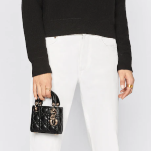 The Lady Dior bag embodies the House’s vision of elegance and beauty. Crafted in black lambskin with signature Cannage topstitching, its iconic silhouette is embellished with a ‘D.I.O.R.’ charm. The micro style can accommodate all the daily essentials and features an adjustable and removable shoulder strap, allowing it to be carried by hand, worn over the shoulder or crossbody.