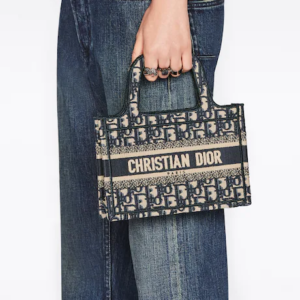 The Dior Book Tote, as imagined by Maria Grazia Chiuri, has become an essential item of the Dior aesthetic. The silhouette is fully embroidered with the House’s hallmark blue Dior Oblique motif. A prime example of Dior savoir-faire, the miniature bag may be carried by hand and can be paired with other Dior Oblique creations.