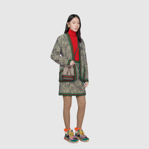 The world of evolves with the introduction of a mini bucket bag shape. Crafted in canvas with inlaid green and red Web stripe along the bottom, the accessory is completed with an adjustable shoulder strap.