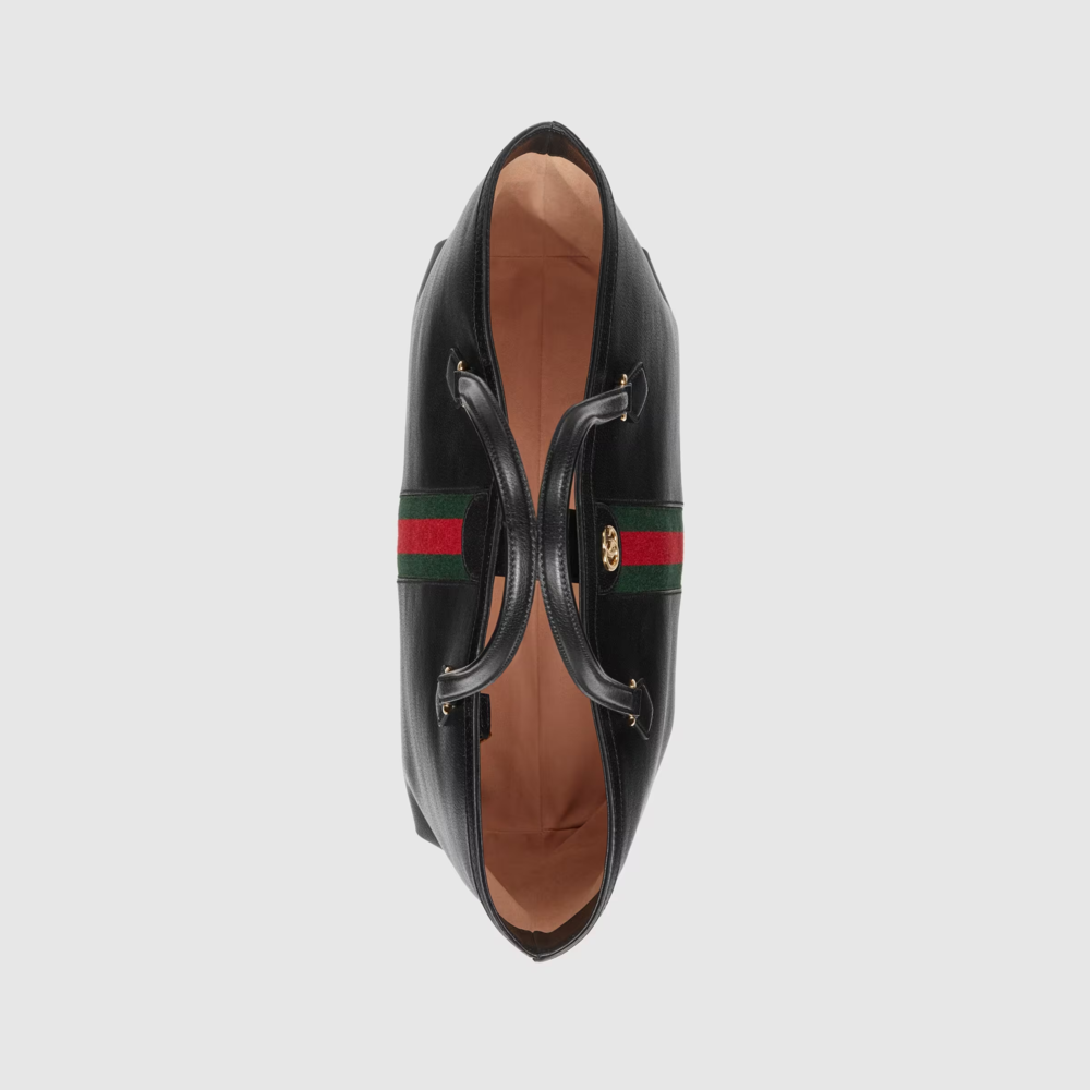 Enriched with details, the world of expands with the introduction of a black leather tote. With a softly structured silhouette, the bag pairs two archival details as a tribute to the origins of the House. The Double G is a reference to Luxury o Luxury ‘s Tote while the green and red Web stripe is a celebration of the brand’s equestrian roots.