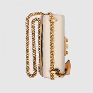 The structured Padlock small shoulder bag is crafted in canvas and white leather. The bag features the collection’s signature padlock closure, reminiscent of the brand’s design roots in the casual luage world.
