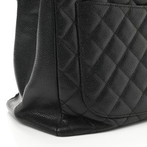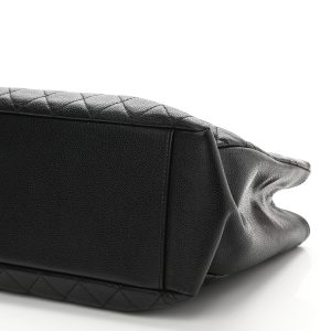 This is an authentic Grand Shopping Tote GST in Black. This stylish tote is crafted of diamond leather in black. The bag features leather threaded polished chain-link shoulder straps with leather shoulder pads. a prominent logo on the front. and a rear flat pocket. The top opens to a partitioned black satin interior with a central zipped compartment. zipper and patch pockets.