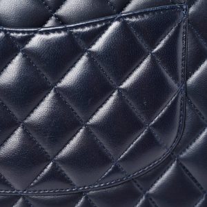 This is an authentic Double Flap in Navy. This shoulder bag is crafted of luxurious blue leather with iconic diamond quilting. The bag features a rear patch pocket. a shoulder strap threaded with black leather and a turn-lock. This opens the front flap to reveal an inner flap and a black leather interior with patch pockets.