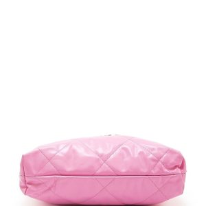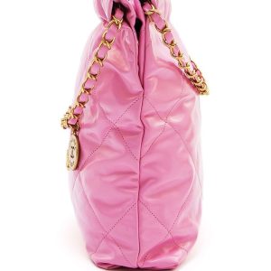 This is an authentic Shiny Calfskin Quilted Small 22 in Black. This stylish handbag is crafted of diamond-stitched calfskin leather in black. The bag features leather threaded silver chain shoulder straps and a matching logo on the front. The open top with magnetic closure leads to a black fabric interior with a zipper pocket and matching removable pouch.